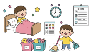 Dressing, feeding, toileting, grooming, and age-appropriate independence in daily activities.
